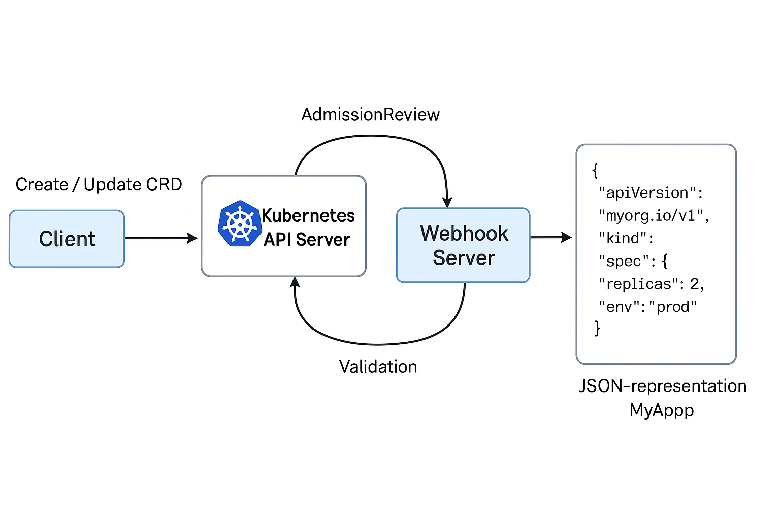 // api/v1/myapp_types.go type MyAppSpec struct { Replicas int `json:"replicas"` Env string `json:"env"` Logging bool `json:"logging,omitempty"` } type MyApp struct { metav1.TypeMeta `json:",inline"` metav1.ObjectMeta `json:"metadata,omitempty"` Spec MyAppSpec `json:"spec,omitempty"` }2. Validation Webhook 구현