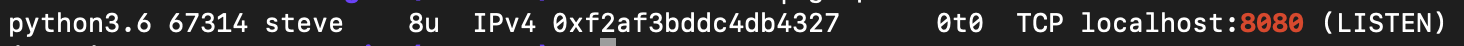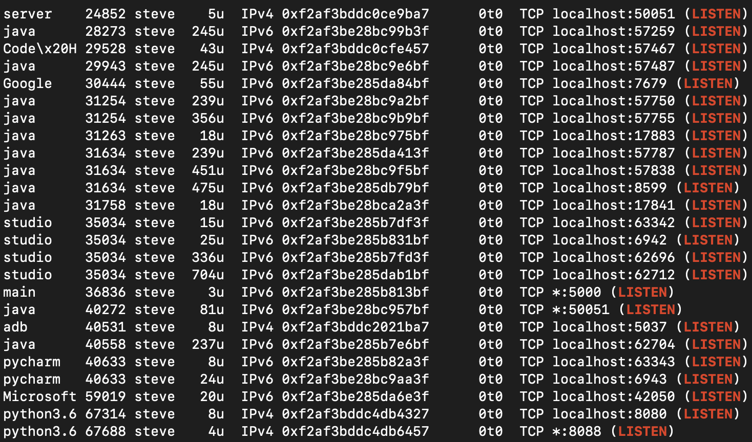 # 특정 포트를 사용중인 프로세스 확인 lsof -i -P | grep "8080" | grep -i "listen" # 포트명이 긴 경우 포트로만도 유효한 경우가 많음 lsof -i -P | grep "8080"결과 예시