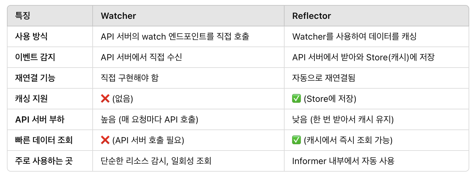 ❌ 메모리 사용량 증가 → 데이터를 캐싱하므로 더 많은 메모리를 사용3️⃣ 🔥 Watcher vs. Reflector 비교