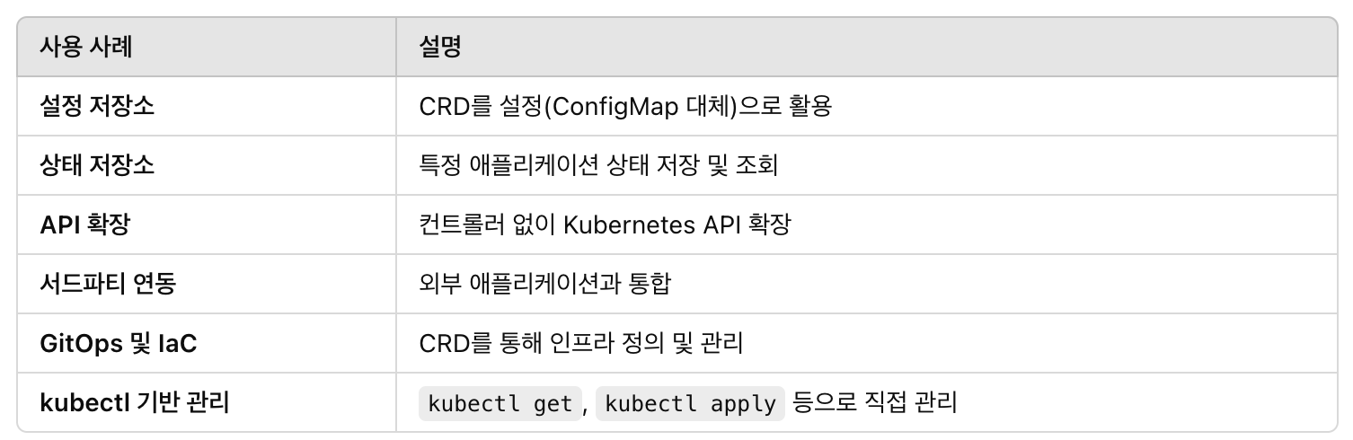 - 컨트롤러 없이 CRD만 정의해도 Kubernetes API로 사용할 수 있음.